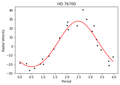 plt.plot( jd % par[3], rv, 'k. ' ) xx = numpy.linspace( 0, par[3], 1001, dtype=float ) plt.plot( xx, mdl.result( xx, par ), 'r-' ) plt.xlabel( "Period") plt.ylabel( "Radial Velocity") plt.title( "HD 76700" ) plt.show()
